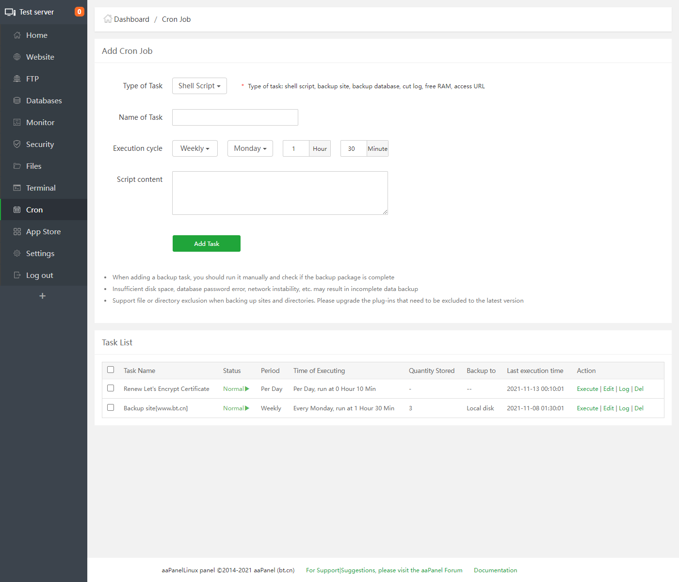 Crontab can be added and executed periodically, shell scripts are supported, website, database backup and log cutting are provided.